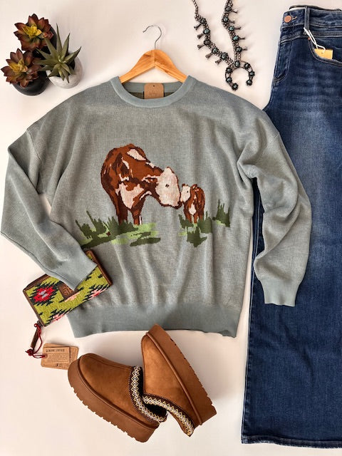 The Musser Hereford Sweater features a gorgeous light blue knit sweater with a Hereford pair knit on the front!