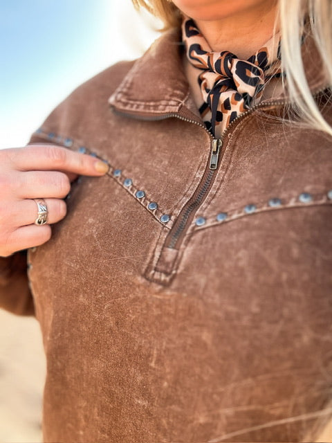 The Cade Chocolate Zip Pullover features all things cozy, comfy, western and chic! A personal favorite here, the dual fabric mineral wash and soft shell side panels make this pullover a unique addition to your closet!