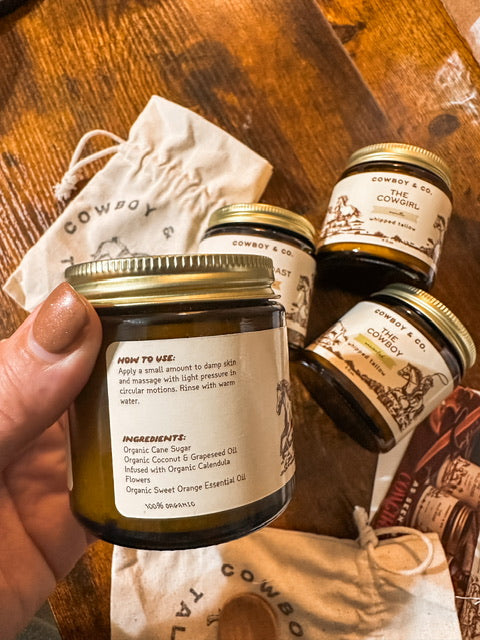 The Cowboy & Co Calendula & Sweet Orange Face Exfoliating Scrub combines finely ground organic cane sugar with a soothing infusion of calendula, coconut, grapeseed, and jojoba oils. This gentle yet effective scrub buffs away dead skin, smooths rough patches, and leaves skin soft, hydrated, and glowing. Crafted in small batches in Wyoming, it’s versatile enough for face, lips, and full-body use.